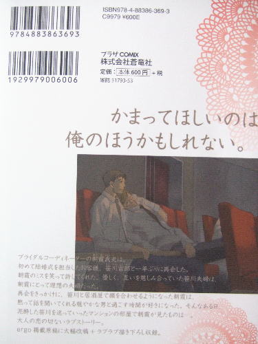 ブライダルコーディネーターの朝霞武史は、初めて結婚式を担当したお客様、笹川吉郎と一年ぶりに再会した。朝霞のミスを笑って許してくれた、優しく、互いを慈しみ合っていた笹川夫婦は、朝霞にとって理想の夫婦だった。再会をきっかけに、笹川と居酒屋で顔を合わせるようになった朝霞は、黙って話を聞いてくれる穏やかな男と過ごす時間が好きになった。そんなある日、泥酔した笹川を送って行ったマンションの部屋で朝霞が見たものは…。大人の恋の切ないラブストーリー。ergo掲載原稿に大幅改稿+ラブラブ描き下ろし収録。