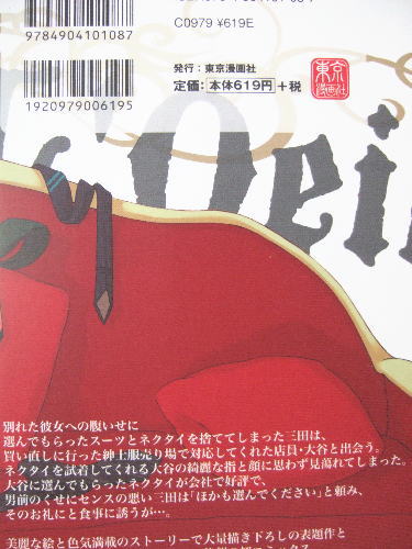 別れた彼女への腹いせに選んでもらったスーツやネクタイを捨ててしまった三田は、買い直しに行った紳士服売り場で対応してくれた店員・大谷と出会う。ネクタイを試着してくれる大谷の綺麗な指と顔に思わず見蕩れてしまった。大谷に選んでもらったネクタイが会社で好評で、センスの悪い三田は「ほかにも選んでください」と頼み、そのお礼にと食事に誘うが…。美麗な絵と色気満載のストーリーで大量描き下ろしの表題作と短編5作品を収録した加東セツコの待望の初コミックス。
