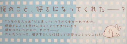 “ただの友人の弟”だと思っていた了から、泣きそうな顔で「好き」と告げられたサラリーマンの良行。了が「望みがない」と諦めて他の男に目を向けようとしていた、まさにその瞬間、良行はのこのこと現れてしまったらしいのだ。それ以来、キッパリ拒絶することも、かと言って受け入れることもできずにいたが、めげずに健気に(ときに図々しく)慕ってくる了に、やがて―?描き下ろしも収録し、大人気シリーズ待望のコミックス化!