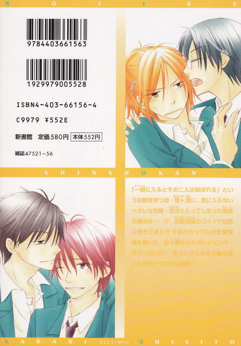 「一緒に入るとその二人は結ばれる」という伝説を持つ池・想ヶ淵に、気に入らないヘタレな先輩・宗方と入ってしまった哉良の運命は・・・!?恋愛成就のコイイケ伝説に巻き込まれた3組のカップルの恋愛模様を描いた、志々藤からりのレジェンド・オブ・LOVE!!各カップルのその後を描いたおまけマンガも収録!